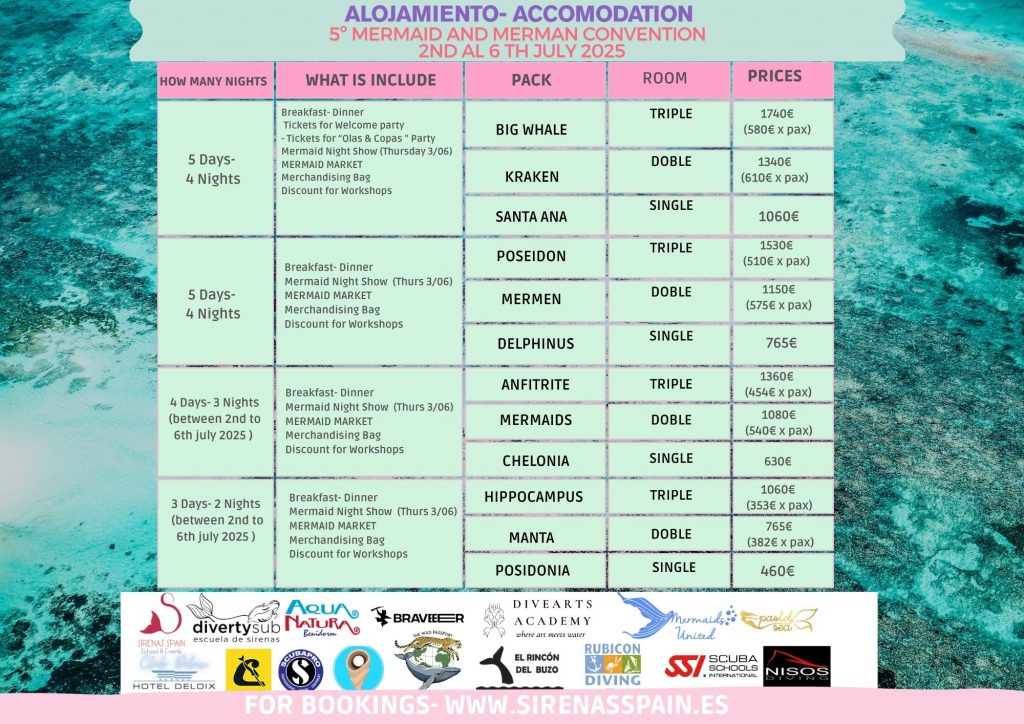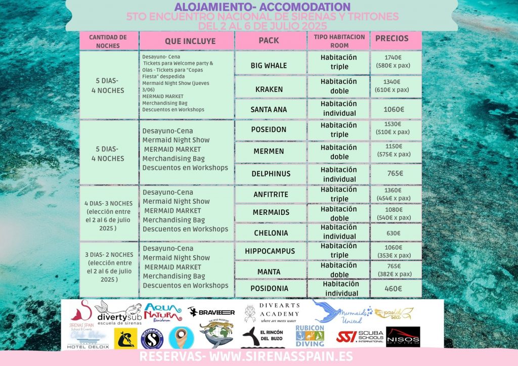 Este año será de 5 días para poder disfrutar de distintas actividades y espacios del mediterraneo y Benidorm. Uno de ellos será POSIDONIA- Certamen de Mermaiding 2025, donde Sirenas y Tritones profesionales podrán participar del Certamen donde se elegirá a los mejores participantes superando distintas pruebas en el Tanque Marino de Aqua Natura Benidorm. Se realizará el día 4 y 5 de Julio 2025.